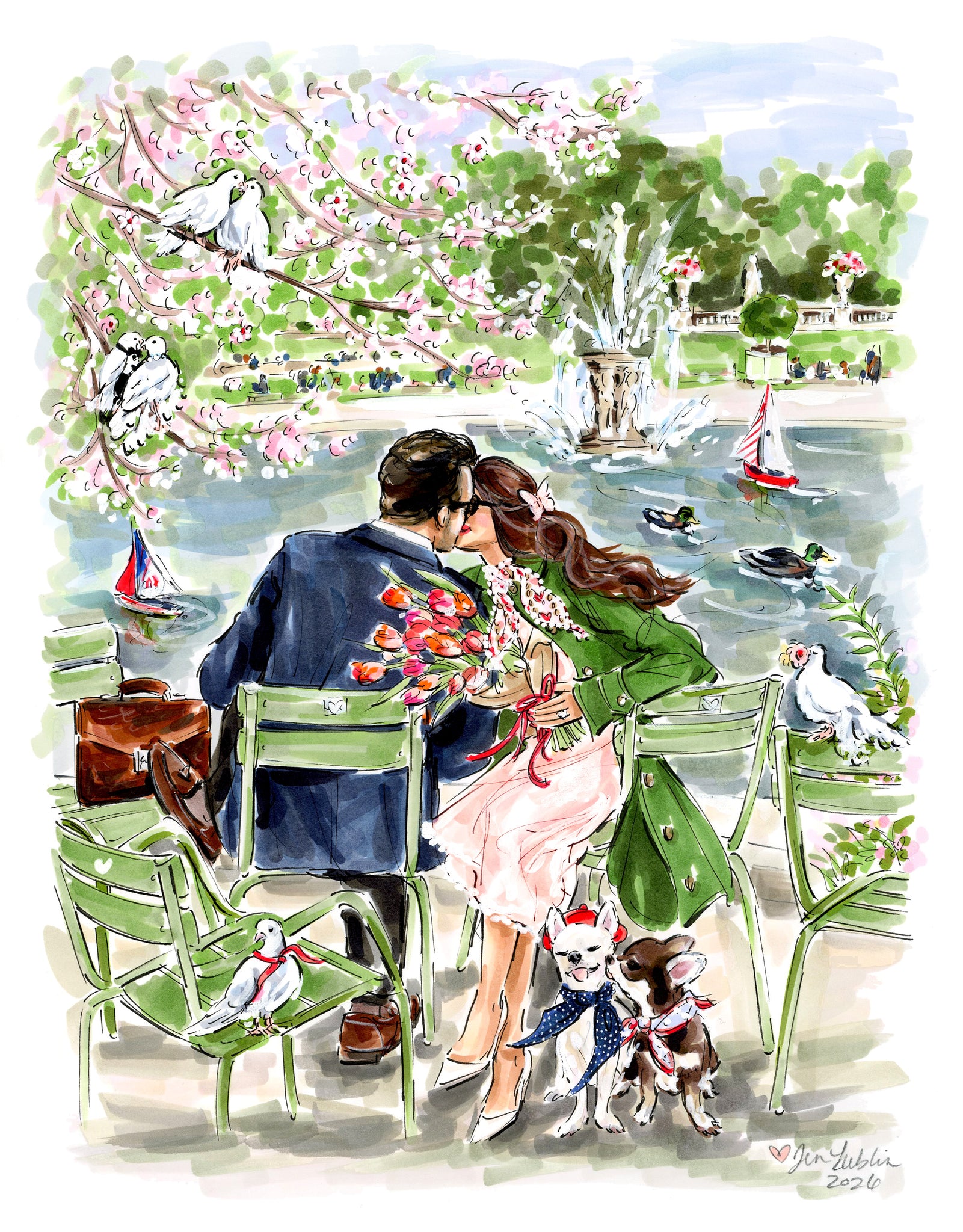 Mixed Media Original artwork of Jen Lublin, titled "Lovebirds” of the ART DE VIVRE Series, dated March 2026. Celebrating Lovebirds of all types with an ode to the start of Spring in the City of Light.