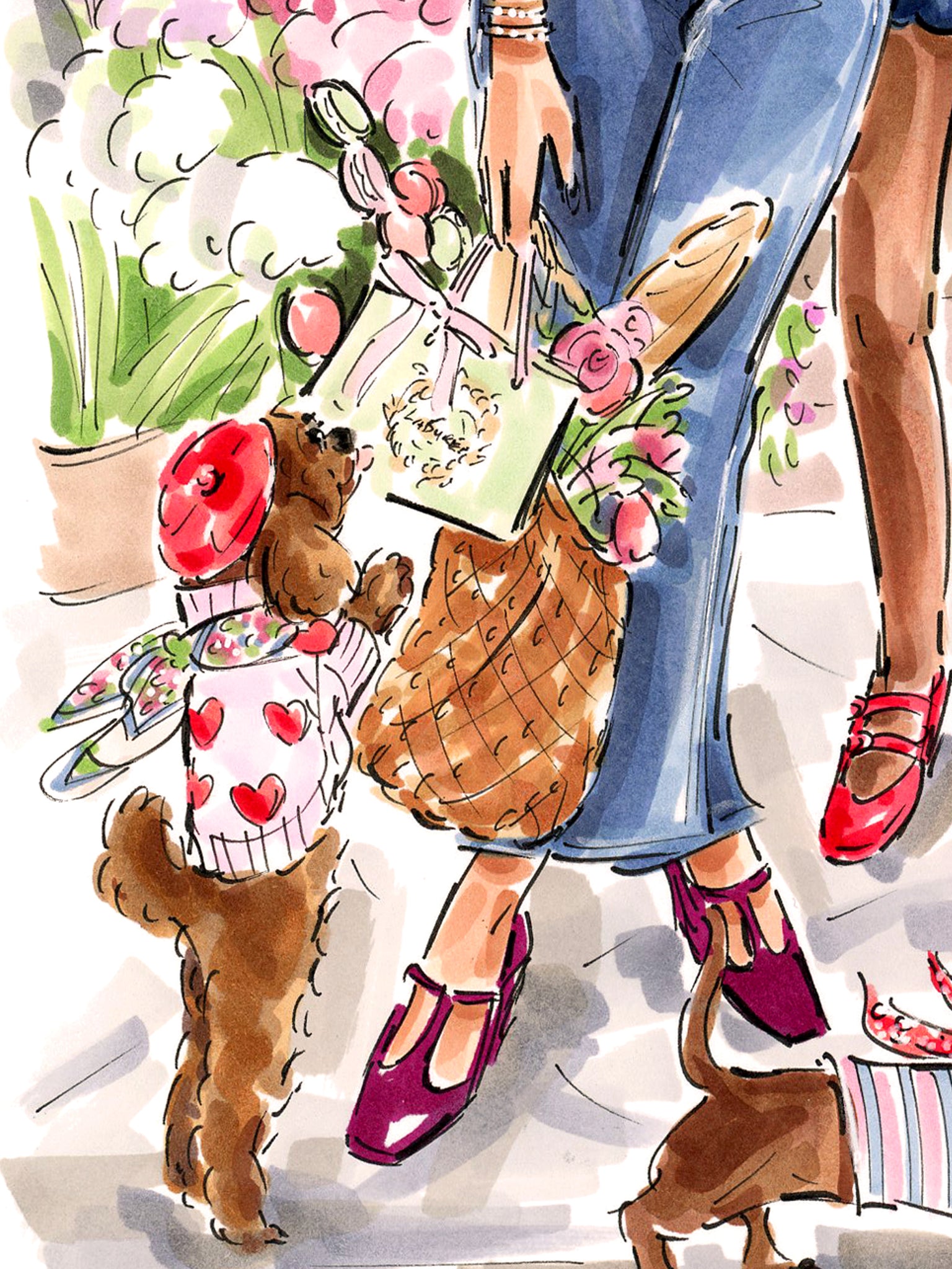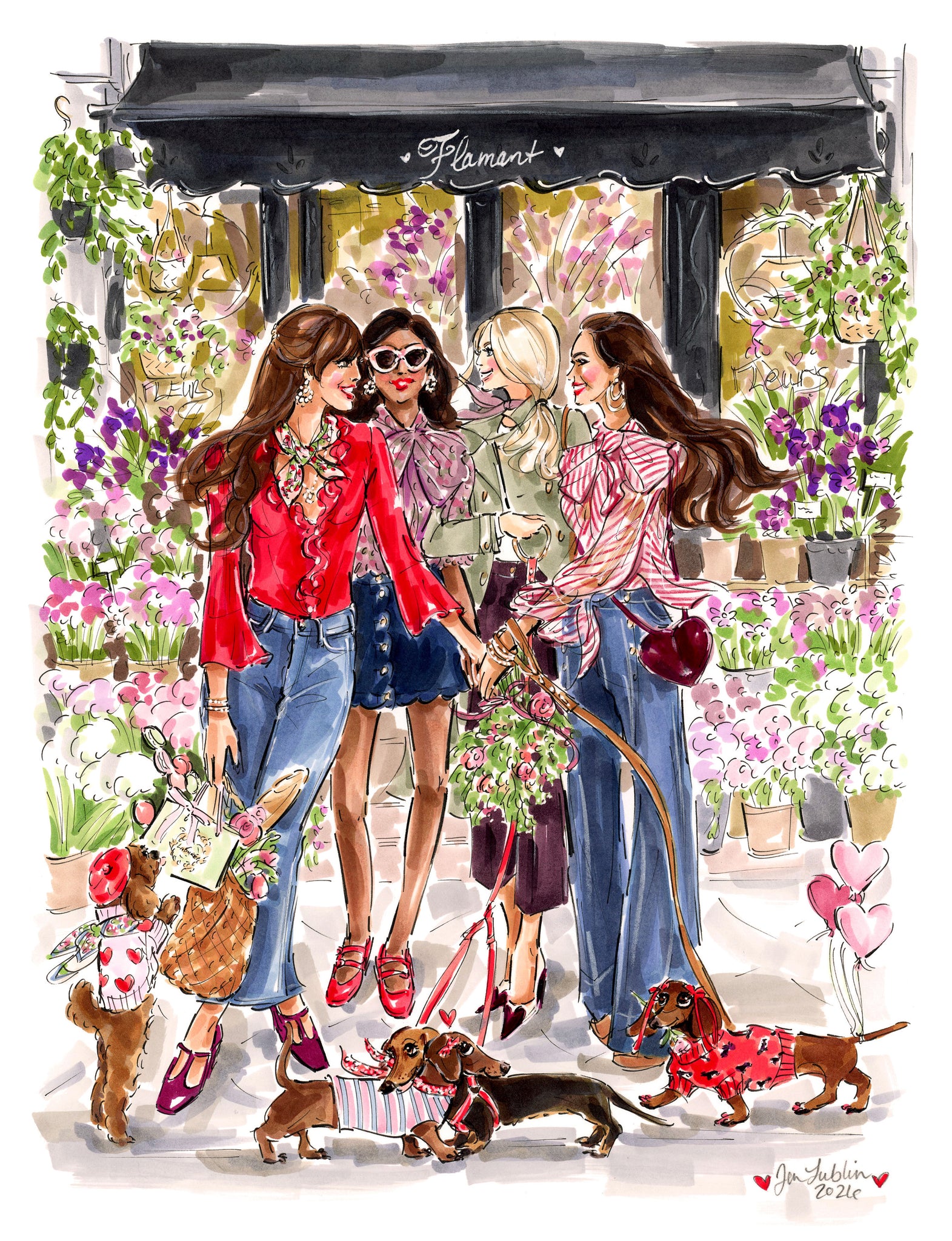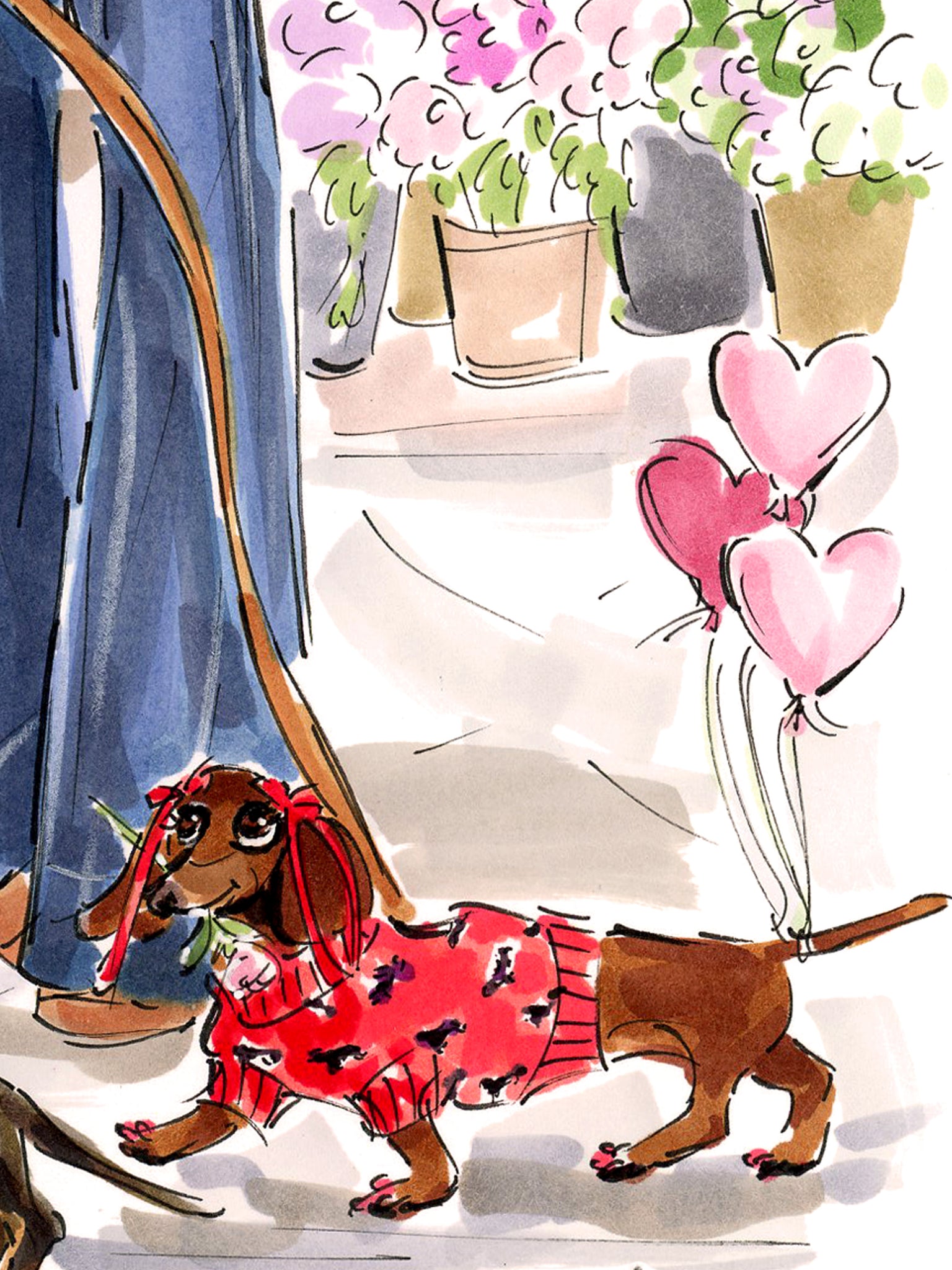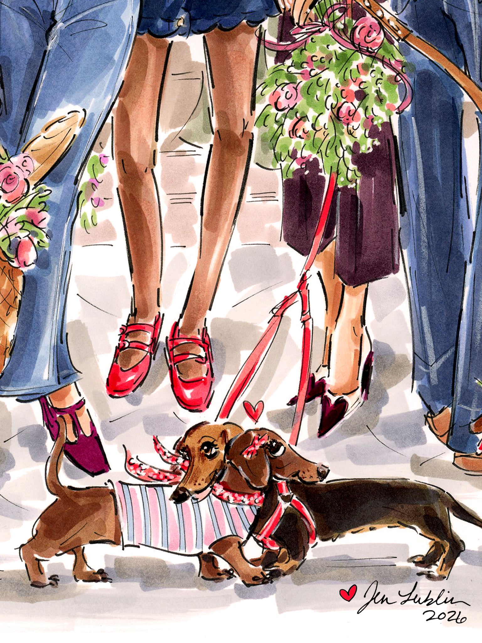 Mixed Media Original artwork of Jen Lublin, titled "Puppy Love” of the ART DE VIVRE Series, dated Valentine's Day 2026. Illustrated in a pet-loving spirit, for the 'PUPS OF PARIS' Subseries.