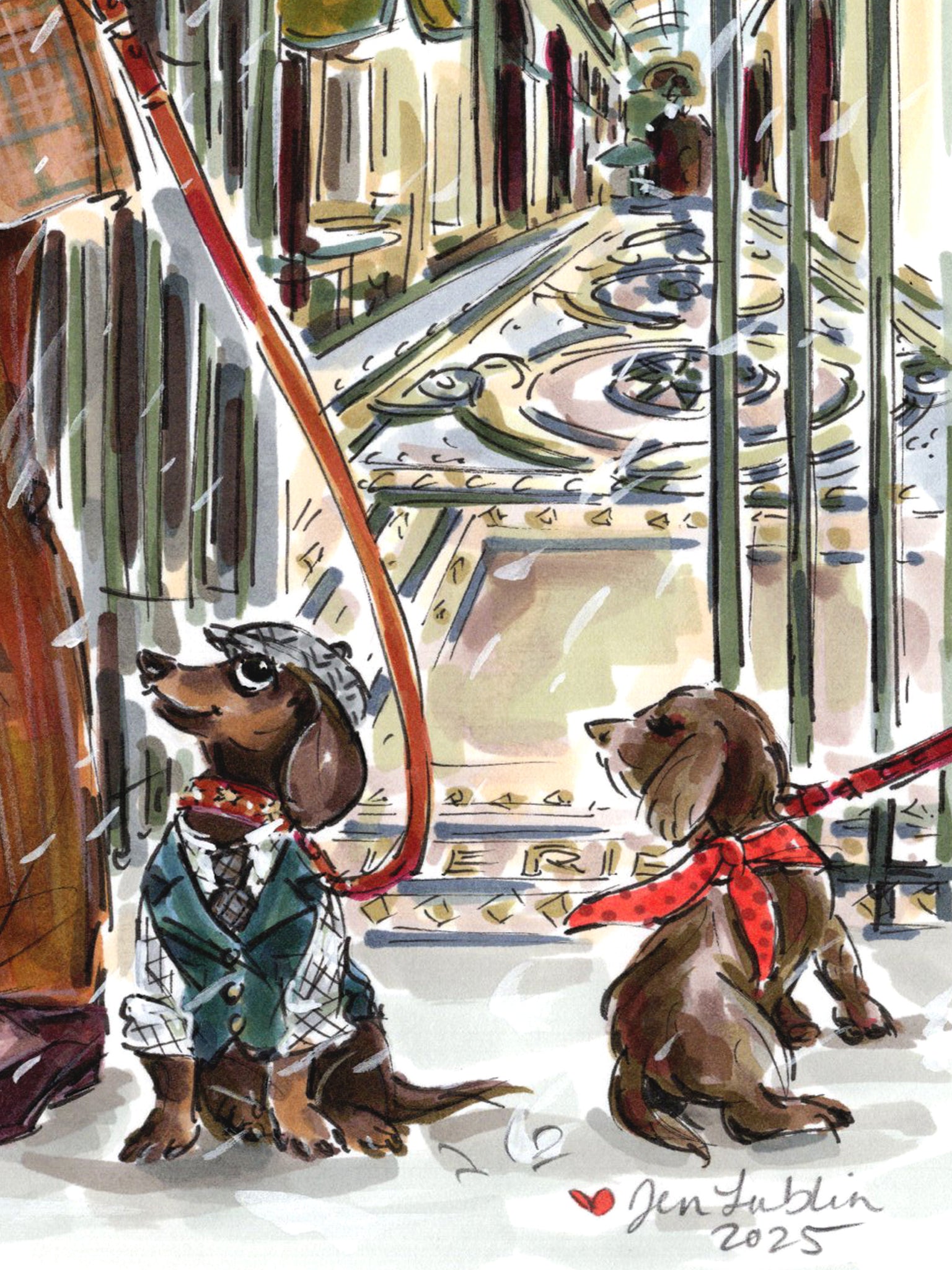 Mixed Media Original artwork of Jen Lublin, titled “Kissing Rose” of the ART DE VIVRE Series, dated October 2025. Illustrated in a pet-loving spirit for the 'PUPS OF PARIS' Subseries, the art depicts the historic passage, Galerie Vivienne and a café terrace scene, situated in Paris' 2nd arrondissement. The work along with many others in the Series, was created on location in the heART of Paris, France.