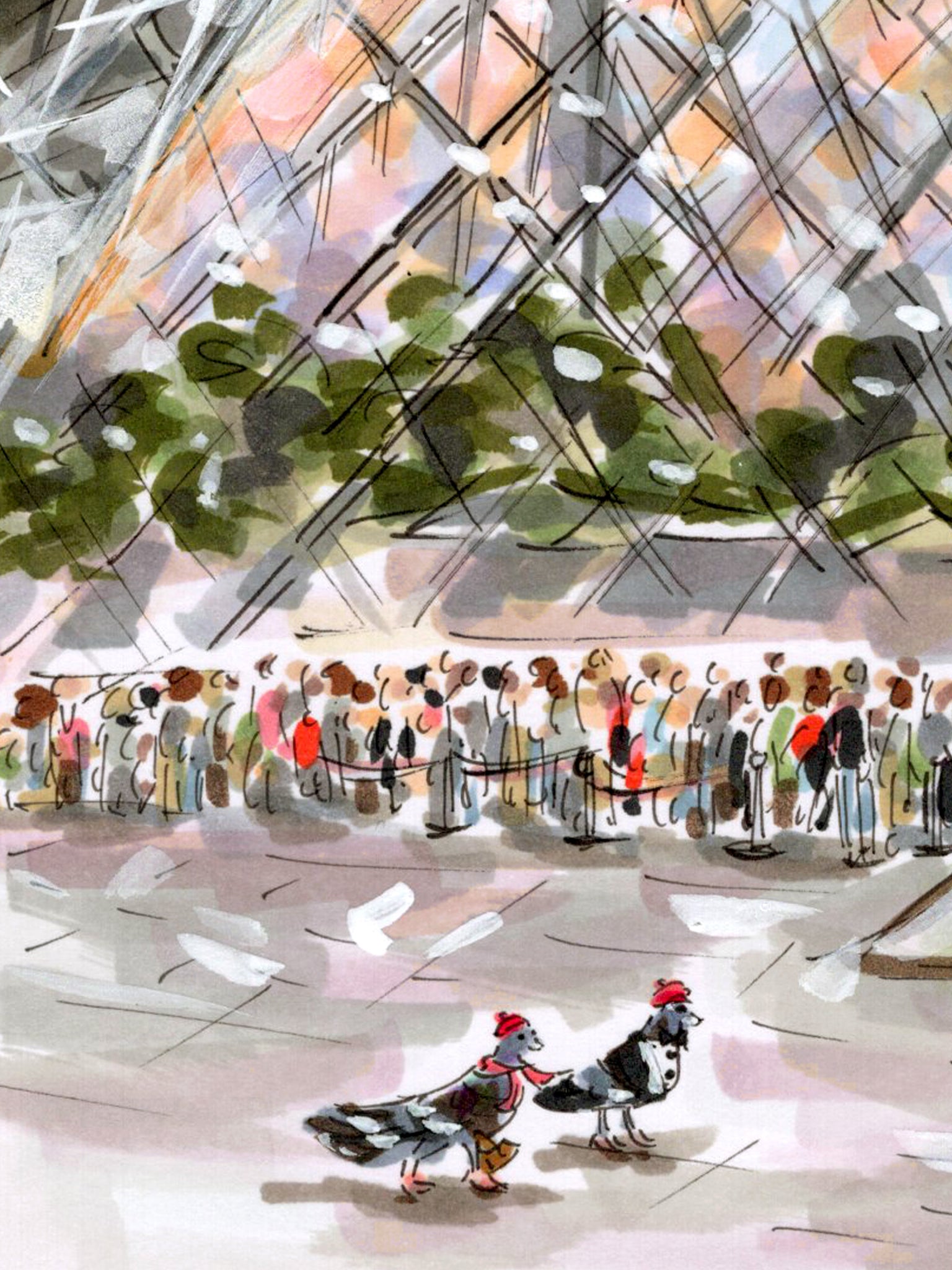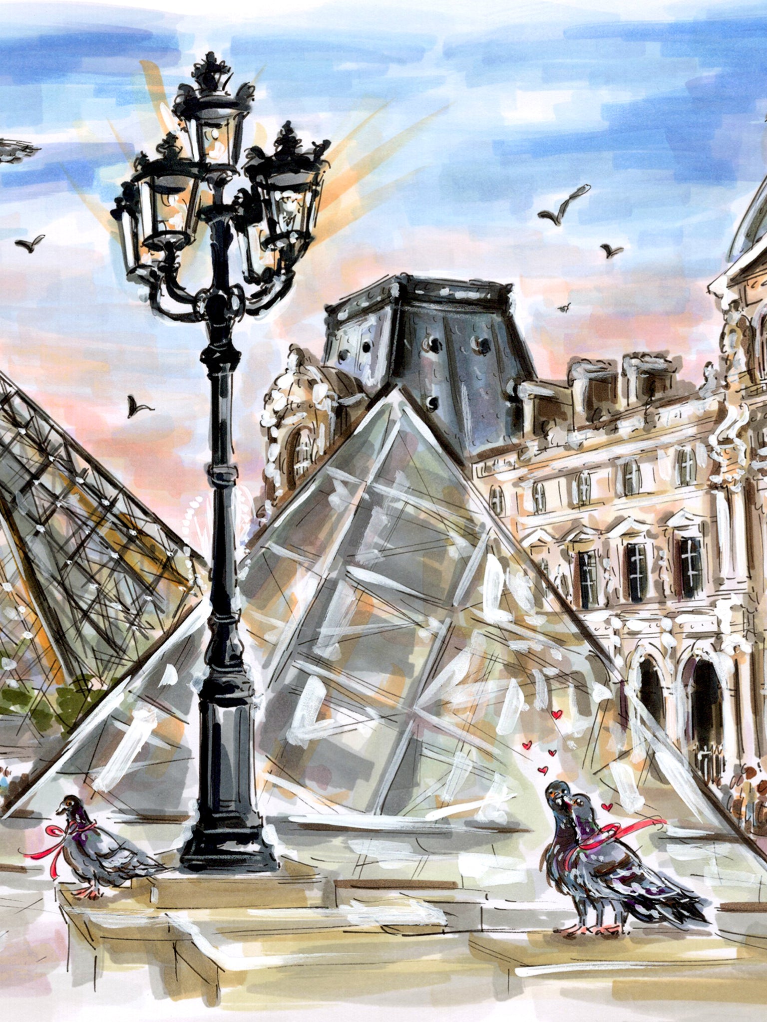 Mixed Media Original artwork of Jen Lublin, titled “Lovebirds of the Louvre” of the ART DE VIVRE Series, dated October 2025. The work along with many others in the Series, was created on location in the heART of Paris, France.